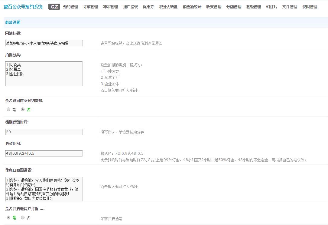 功能介紹: 一、預(yù)約保留時間:可設(shè)置訂單的保留時間,即未付款超過保留時間自動關(guān)閉訂單,重新開放預(yù)約。 二、預(yù)約時間:前臺開放14天的預(yù)約時間,后臺展示25天的預(yù)約(便于設(shè)置不能預(yù)約,如放假等),每天的凌晨自動生成預(yù)約時間,每個套餐的預(yù)約時間設(shè)置可不一樣。當(dāng)前時間大于預(yù)約時間會自動改為不可預(yù)約。如現(xiàn)在為10點,所有10點前的預(yù)約時間段都不可預(yù)約了。 三、改檔期或訂單取消:已付款訂單取消預(yù)約,可根據(jù)離預(yù)約的時間退相應(yīng)比例的訂金。用戶有改檔期的功能,更改檔期后原檔期重新自動開放預(yù)約。后臺可設(shè)置是否開啟該功能及最多可更改次數(shù)。 四、短信驗證:短信驗證是驗證電話號碼的真實性,防止惡意預(yù)約,使用阿里大于短信驗證,價格≤4.5分/條。充值金額1元起充。 五、預(yù)約提醒:短信和公眾號模板消息提醒,訂單提醒商家及時知道預(yù)約,免去網(wǎng)站后臺查看。用戶預(yù)約成功,取消預(yù)約,上傳底片結(jié)束訂單。后臺可設(shè)置是不是開啟。 六、分店管理:可添加多個城市多個分店。可設(shè)置已開通的和即將開通的城市,如果只有單個城市預(yù)約直接跳過城市選項。分店可設(shè)置分店的基本信息,如分店的店名、地址、郵箱、電話、公交線、 是否啟用及啟用的套系。 七、套餐管理: 1、可設(shè)置通用或者哪個城市的套餐,通用即全部城市。 2、套餐信息:如套餐名稱、套餐原價、套餐加拍價、套餐訂金、套餐服務(wù)時間、套餐的圖標(biāo)等等。 3、可在后臺上傳套系的圖標(biāo)和樣片。 4、可調(diào)用分店的預(yù)約時間,也可以獨立設(shè)置套餐的預(yù)約時間段。 5、可設(shè)置是否電話預(yù)約,是否啟用。 6、可添加套餐的描述。 7、每個套餐可設(shè)置不同的可加選套餐,如預(yù)約拍半身照,預(yù)約時加選證件照套餐,證件照可享優(yōu)惠。 八、預(yù)約管理:預(yù)約是根據(jù)城市——分店——套餐,可管理25天內(nèi)的預(yù)約,可設(shè)置時段或者日期(天)是否可預(yù)約,默認(rèn)為可預(yù)約。可根據(jù)分店隨機關(guān)閉未來五天的預(yù)約。 九、訂單管理:訂單是根據(jù)城市——分店及訂單狀態(tài)劃分,訂單狀態(tài)分:已付款、未拍攝、待付款、已退款(大于48小時取消)、用戶取消(48小時內(nèi)取消)、用戶取消、過期關(guān)閉、已結(jié)束八種,管理員可在后臺手動添加訂單。根據(jù)用戶手機、姓名、郵箱、openid查找用戶的訂單。 十、底片管理:已付款訂單可上傳多張底片,底片格式可以是jpg、png、gif格式,可添加、刪除、排序底片。上傳完底片訂單狀態(tài)可改為已結(jié)束,用戶就可以在我的訂單下載底片了。每個分店可設(shè)置一個管理員在手機上查看所有完成訂單的底片,及多個用戶可在手機上查看預(yù)約的訂單。 十一、一級分銷返利功能,可以查看推廣人數(shù),返利訂單明細(xì)和申請?zhí)岈F(xiàn)。推廣利器。可根據(jù)用戶手機、姓名、郵箱、用戶id查找用戶的信息 十二、統(tǒng)計銷售額:訂單可填寫實際消費的金額,可根據(jù)日期統(tǒng)計銷售額的功能(規(guī)則:默認(rèn)統(tǒng)計實付金額,如實付金額未填將為訂單總金額)。可統(tǒng)計化妝、修片數(shù),方便統(tǒng)計及計算工資。 十三、收支管理:可了根據(jù)分店添加收入支出表,字段有收入/支出、金額、用途、日期、憑證、化妝數(shù)、修片數(shù)、操作人,憑證為上傳圖片,操作人可以多個,在分店管那添加,可根據(jù)日期段、操作人算出支出或收入的金額。 十四、月份財務(wù)統(tǒng)計表:公司的贏利狀況一目了然。 十五、權(quán)限管理:超級管理員可添加分店管理,分店管理員只能看到該分店的信息,一個分店可給多個管理員管理,分店管理員設(shè)置員工賬號的管理權(quán)限,可對文件管理、分店管理、套系管理、預(yù)約管理、訂單管理、刪除訂單、銷售額統(tǒng)計、訂單管理中添加收支、收支管理、月收入管理、推廣提現(xiàn)、沖印管理的權(quán)限設(shè)置。 十六、文件管理:可在后臺管理所有模板圖片及模板文字的功能。具有恢復(fù)最早版本的功能。 十八、、優(yōu)惠券:超過營銷利器! 1.1、可設(shè)置是否開啟優(yōu)惠券、優(yōu)惠券金額、優(yōu)惠過期周期、開啟發(fā)放優(yōu)惠券通知。 1.2、預(yù)約的客戶結(jié)束訂單會生成一個優(yōu)惠券碼,并通過公眾號發(fā)送消息給客戶。得到的優(yōu)惠券碼可下次預(yù)約時輸入券碼立減金額,也可把券碼發(fā)給別人用。 1.3、用戶可在后臺查看優(yōu)惠券的詳細(xì)信息,優(yōu)惠券狀態(tài)分類為未消費、使用中、已消費、已過期。 1.4、管理員可在后臺管理優(yōu)惠券及改變優(yōu)惠券的狀態(tài),如把未消費改成已消費等。 1.5、可生成優(yōu)惠券及導(dǎo)出csv文檔,在預(yù)約輸入優(yōu)惠券碼減價使用。場景如:在新浪微博生成微卡券,上傳優(yōu)惠券碼,客戶預(yù)約時輸入券碼減價,也可以在線下發(fā)優(yōu)惠券。 十九、積分大轉(zhuǎn)盤(本模塊為收費模塊):大轉(zhuǎn)盤游戲是圍繞積分和優(yōu)惠券展開,讓會員主動分享,以達(dá)到增加粉絲的效果,具體流程如下: 已關(guān)注的粉絲可通過分享