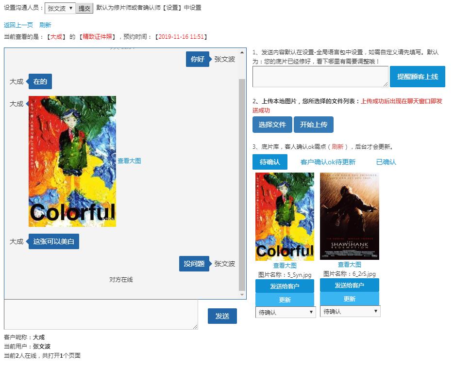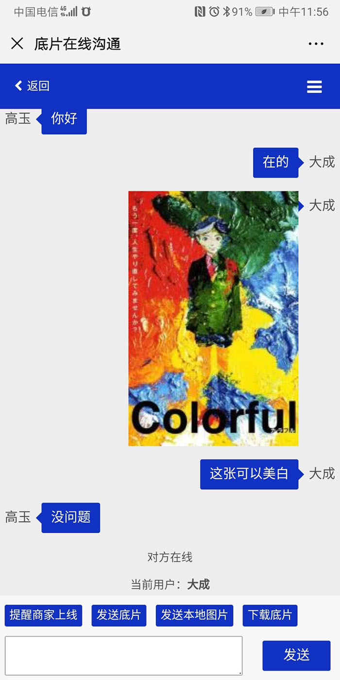 1.2、可發送給對方文字、底片、本地圖片。更改底片狀態,如待確認改成已確認。