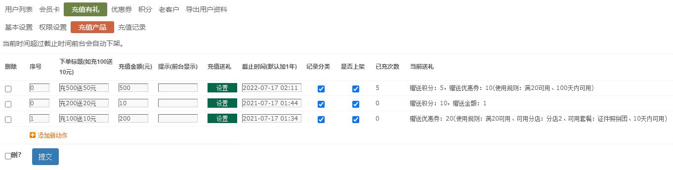 [支持]充值贈送積分、金額、優惠券或組合使用。如充200送50元。