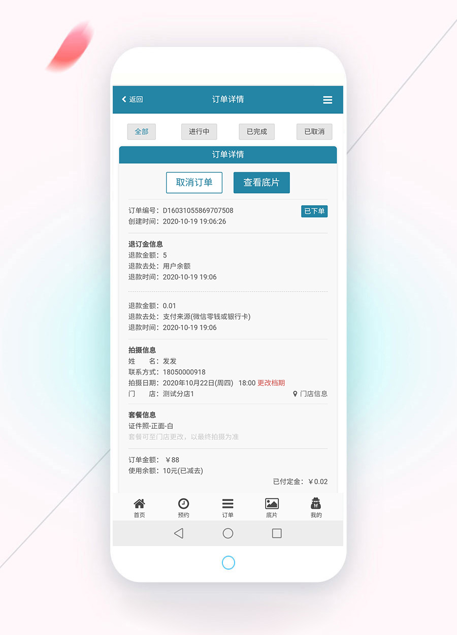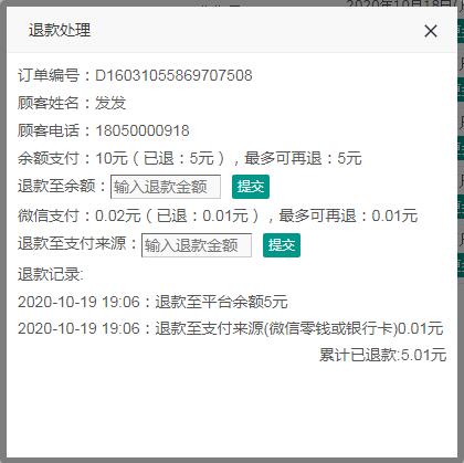 [新增]訂單展示頁新增加了退款記錄,除了用戶取消訂單根據規則退訂金外,新增了后臺手動退款給客戶。可多次退款,退款至余額或者微信支付來源。