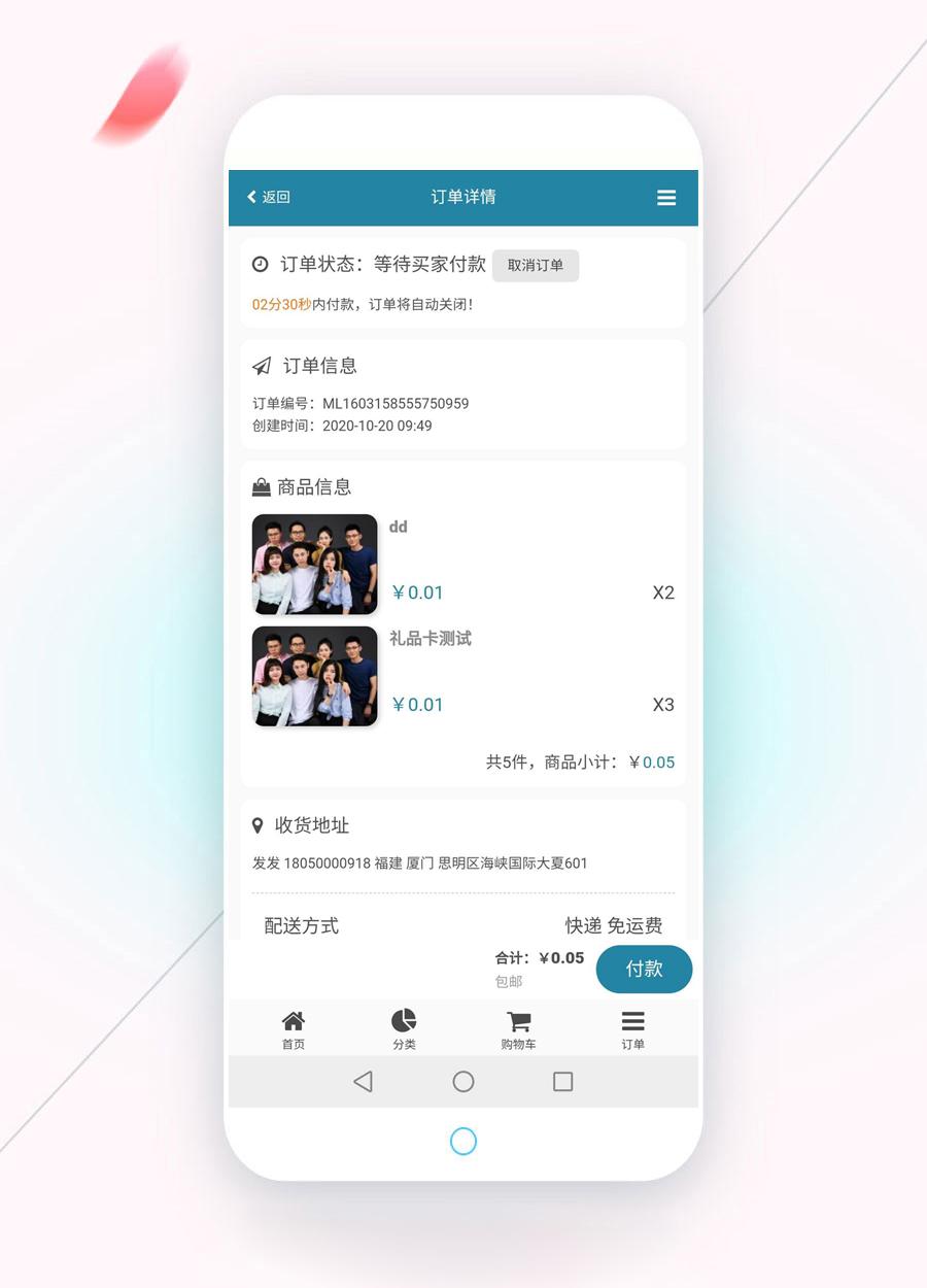 采用購物車方式,類似有贊商城,支持出售禮品卡,實物,虛擬產品,自定義界面,商品分類,商品規格,余額支付,取消訂單,退貨退款,發貨退貨物流跟蹤,快遞費設置,商品自動下架,可選取消訂單立刻退款和后臺手動退款等功能,前臺頁面包括首頁,分類列表頁,商品展示頁,購物車頁,訂單確認頁,訂單列表頁,訂單詳情頁。 所有頁面頂部均可設置:顯示頂部條、僅顯示右上角菜單、都不顯示這三種。不同頁面可設置不一樣。 頁面截圖: