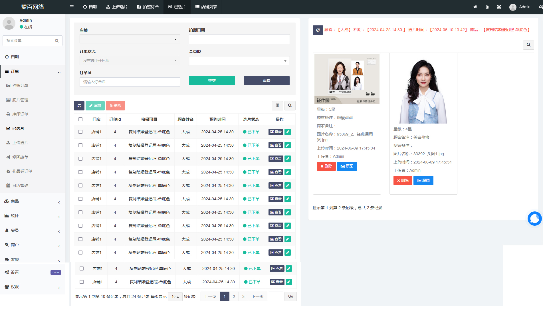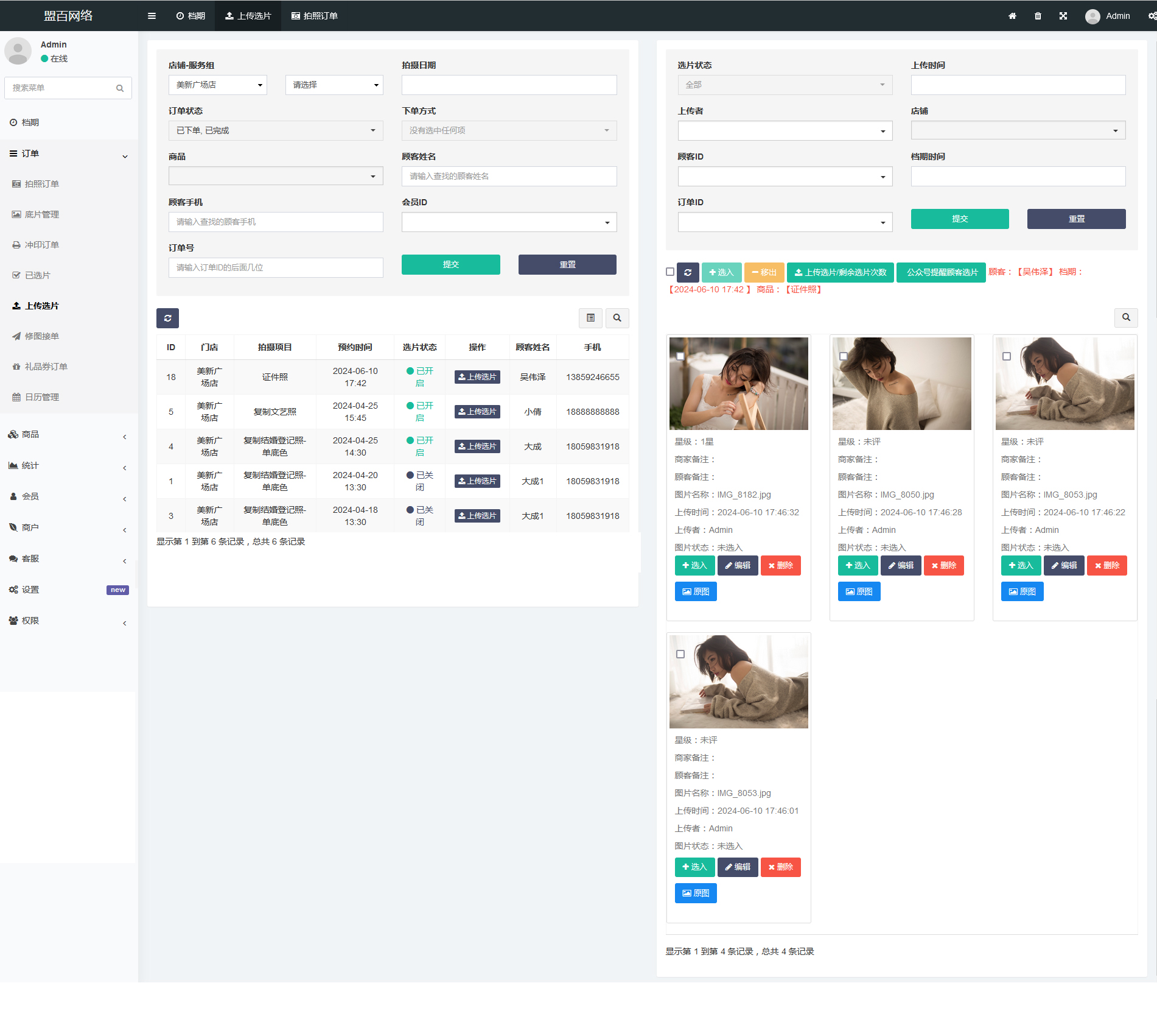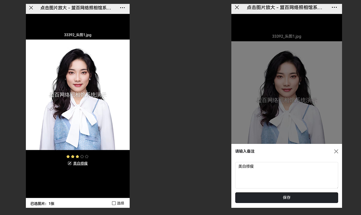 本次主要新增遠程在線選片功能和優化一些后臺的使用,遠程在線選片不限上傳圖片數量,同時支持商家后臺和顧客手機端選片,支持商家和顧客添加備注、對圖片打分,可按打分分數和已選分類,自動對圖片加水印、可設置選片次數,可對顧客發送選片通知,顧客選片下單默認發送上傳者通知,也可設置發送給其它管理員通知。 / 在線功能介紹 / 遠程在線選片主要用于外拍或者在店鋪拍攝未來得及選片,可以節省大量當場選片時間和增加銷量。 1. 前臺界面展示 2. 后臺界面展示 /其它更新 / 1、優化手動添加訂單。 2、優化切換門店檔期。 3、優化后臺拖動排序。 4、優化DIY圖片櫥窗組件界面樣式。 以上為僅為部分功能介紹,更多的功能請到本公眾號演示站體驗,或聯系以下微信號體驗后臺 |
