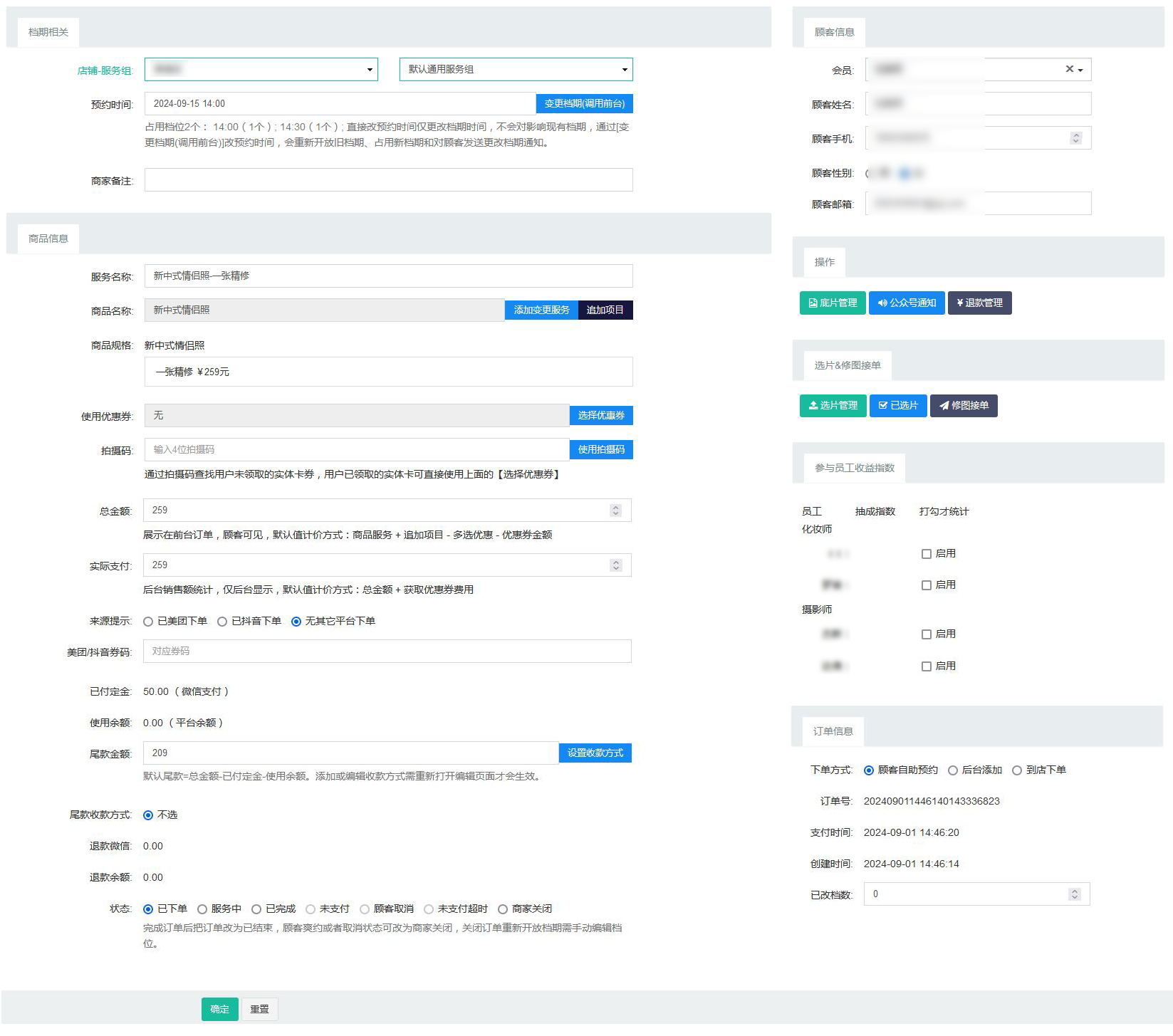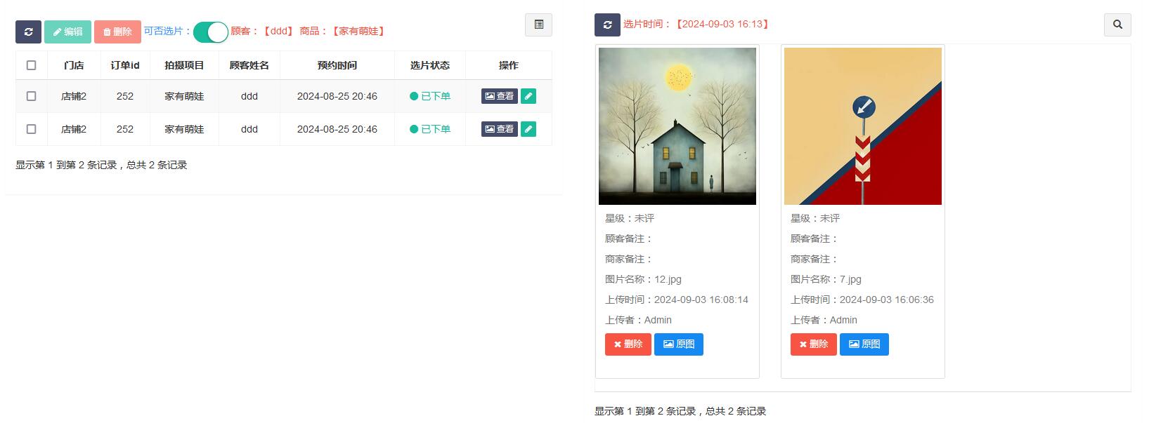 本次優化了大量后臺使用,員工賬號只需在檔期和拍攝訂單操作即可。 1.檔期頁增加聚合數據 檔期和訂單數據一目了然 2. 優化拍照訂單相關頁 訂單列表 訂單詳情頁,可操作所有關于訂單的信息,如更改檔期、更改服務、追減項目、核驗優惠券、底片管理、公眾號通知、退款管理、選片管理、修圖接單等等進行操作。 底片管理 遠程底片確認溝通面板 選片管理 選片訂單,支持多次選片 修圖接單 /其它更新 / 1、前臺商品規格新增可選必須選擇設置。 2、使用美團或者抖音新增可輸入券碼。 3、新增可設置數據保存時長,包括訂單保存時長、底片、選片、修圖接單圖片保存時長。 4、新增可設置已下單、服務中的訂單超過設置天數自動改為已完成。 5、新增公眾號通知可同步到不同門店。 6、新增可設置尾款的收款方式。 7、新增后臺使用文檔,由于持續增加新功能和優化后臺,以致文檔滯后。將在這個月內完善文檔。 8、優化配色管理,使用更簡單。 以上為僅為部分功能介紹,更多的功能請到本公眾號演示站體驗,或聯系以下微信號體驗后臺 |